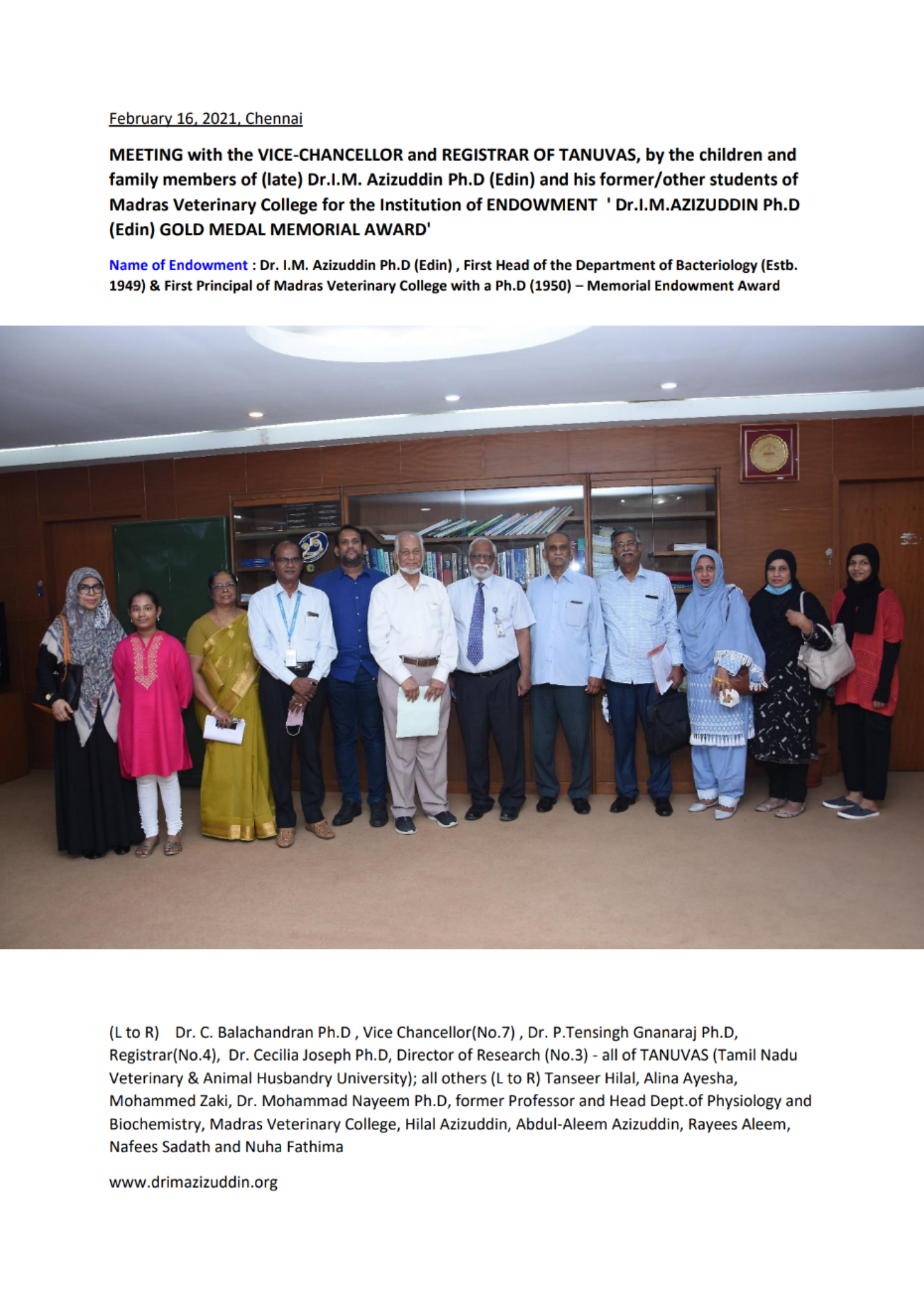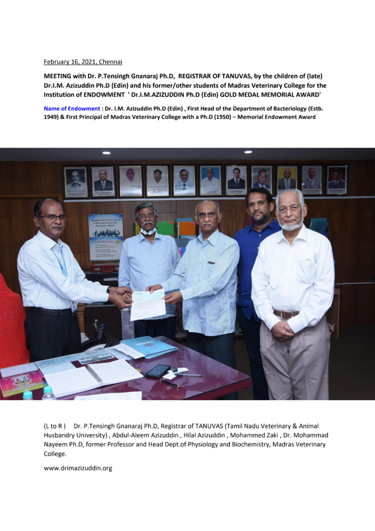 Dr.I.M. Azizuddin Ph.D (Edin), First Head of the Department of Bacteriology (Estb.1949) & First Principal of Madras Veterinary College with a Ph.D (1950) – Memorial Endowment Award
